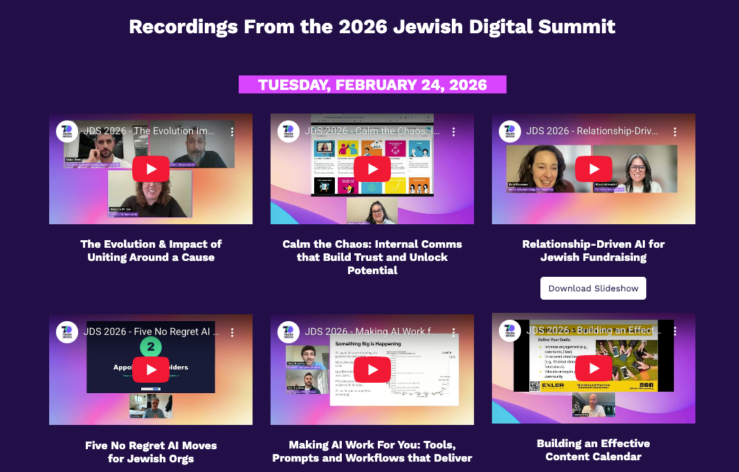 Get instant access to all sessions from the 2026 Jewish Digital Summit, covering Jewish media, fundraising, technology, and community growth. Watch at your own pace, anytime you want.